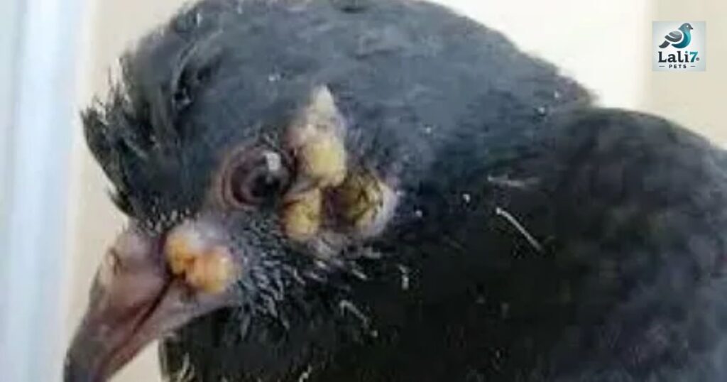 - Appearance: You will see crusty, wart-like growths on the unfeathered parts of the bird’s body.